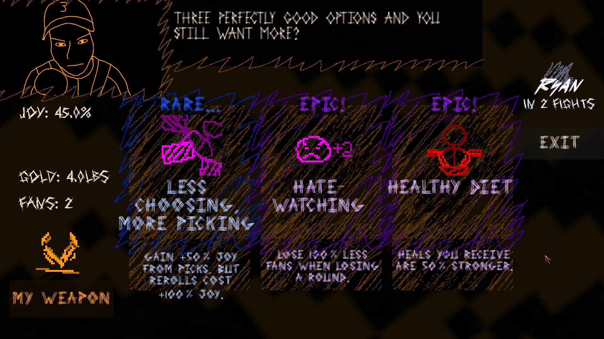 The game where you pick from three! Choose your weapon ball and fight others in unstable best-of-3 matches, upgrade your stats, and bounce around the arena until you finally claim victory. Get popular and have your fans assist you, and befriend the Ref to maximize your odds.