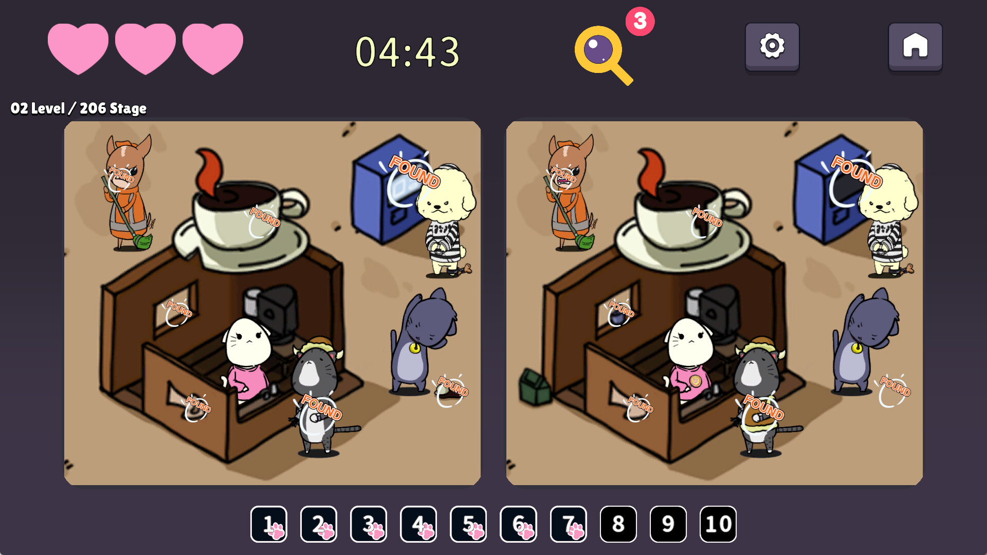 This is a “spot the difference” game featuring many cats and dogs. Find the strange and unusual details hidden in their everyday lives!!