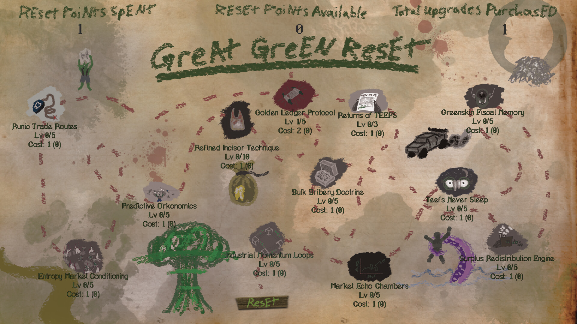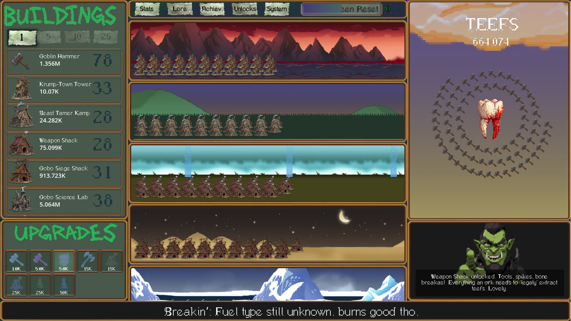 TEEFS is a goblin and ork themed idle clicker where you build a wildly unethical TEEFS based economy from the ground up. The dawn of da great green bonkin' machine is yours to command. Make da valley green. Make da sky green. Make da water green. Its your great green destiny, now go fulfill it!