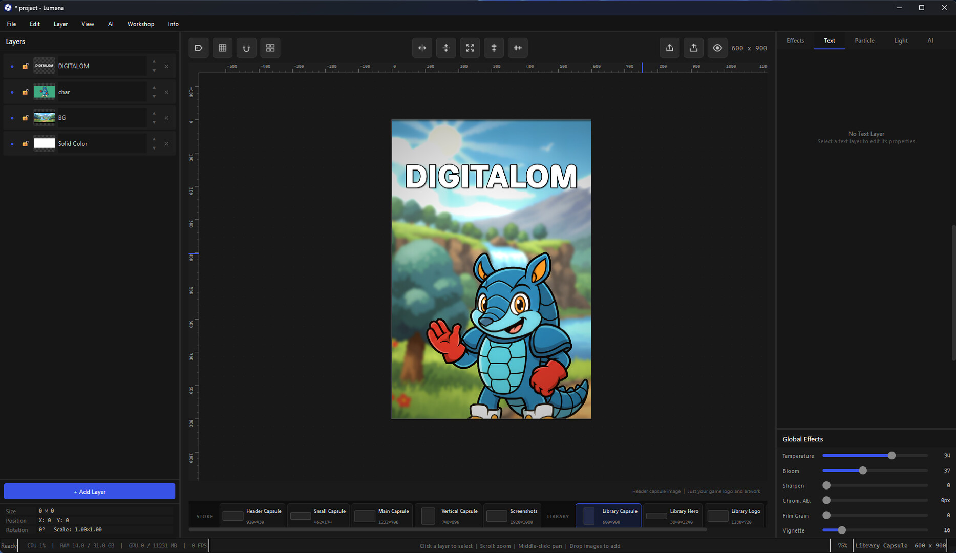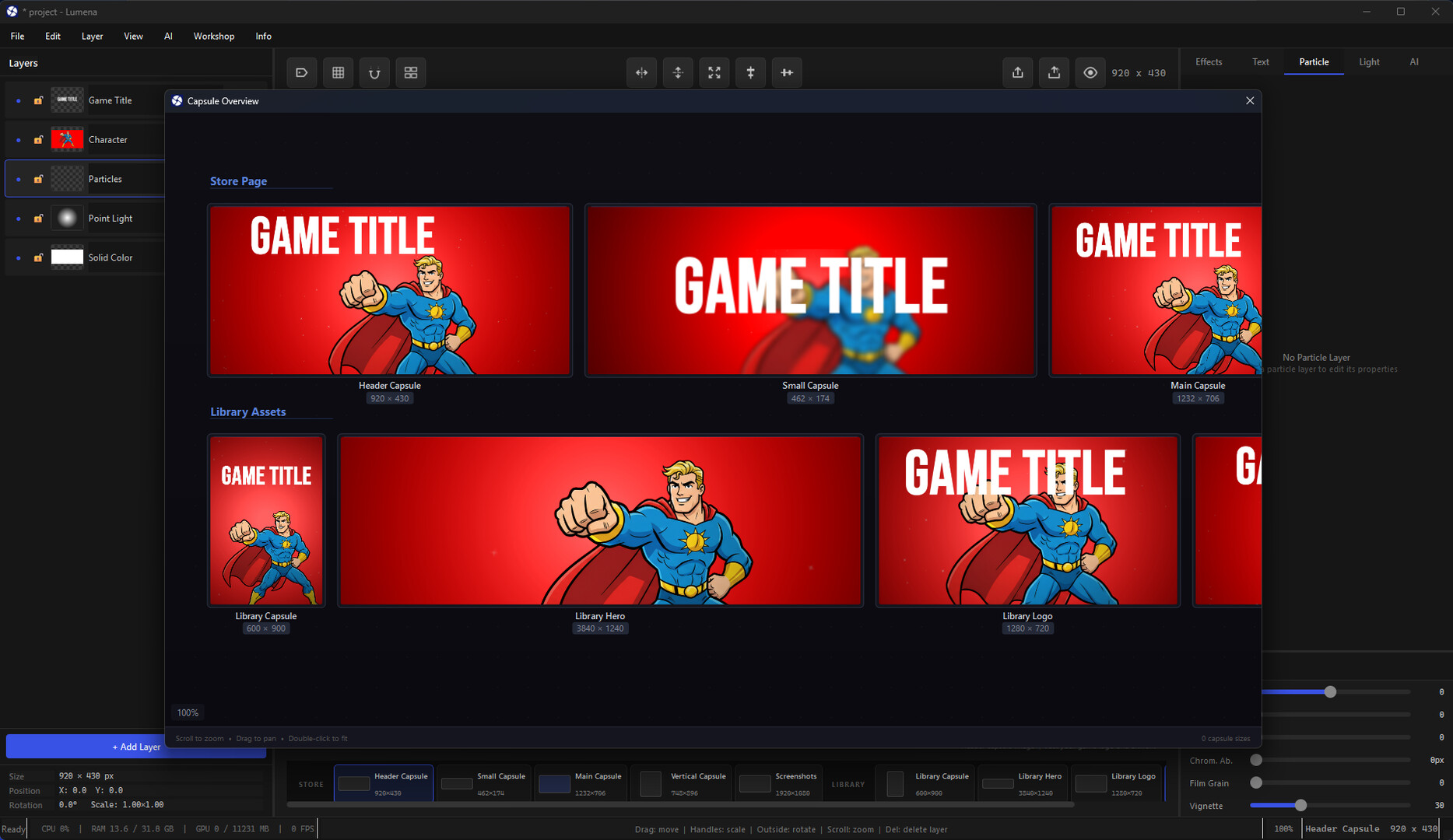 Lumena is a dedicated tool for creating Steam store capsule art. Design all 9 capsule sizes in one project with layers, 30+ effects, text, particles, lights, AI background removal, upscaling, and Steam Workshop template sharing.
