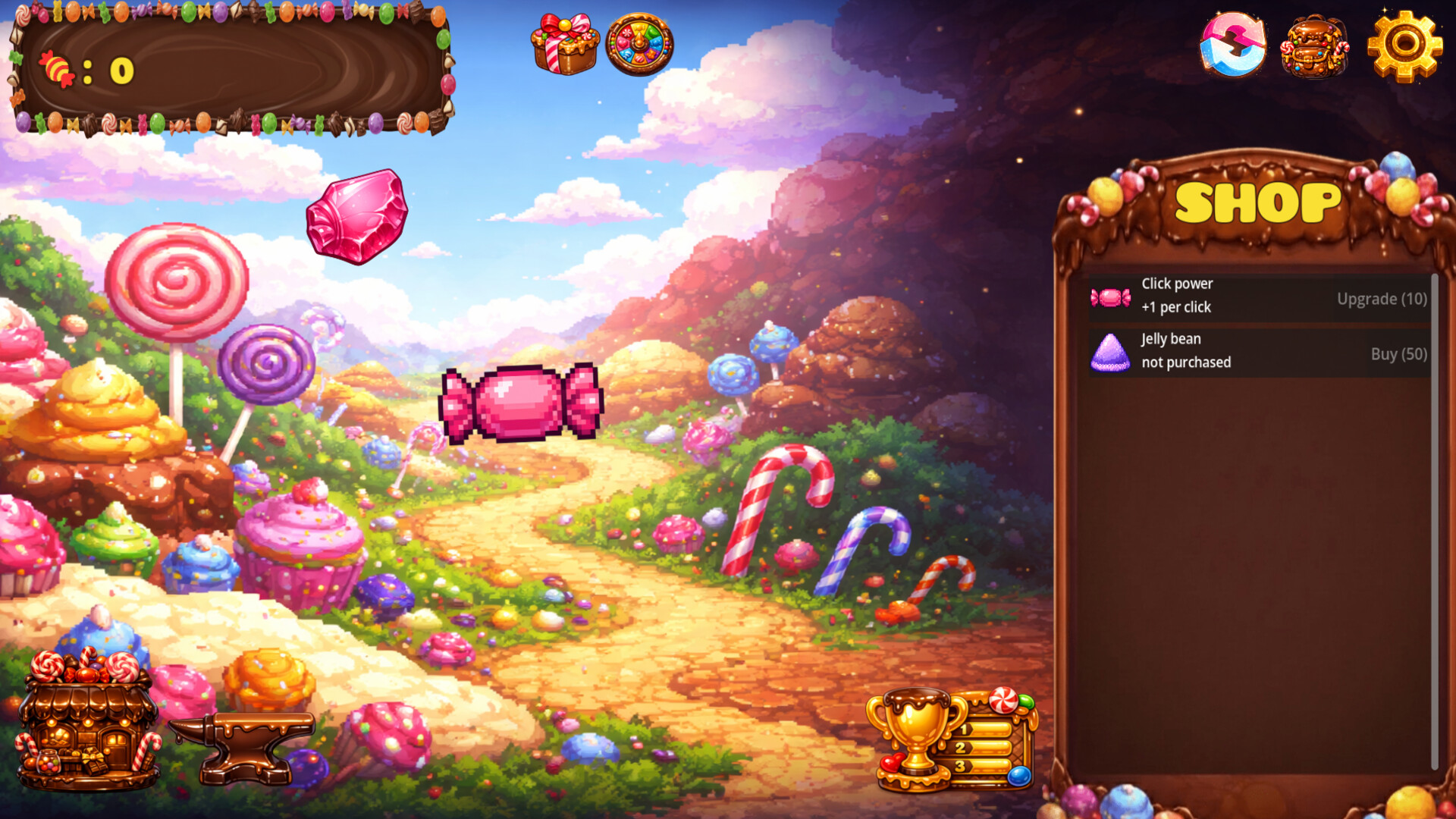 Candy Clicker is a cozy candy clicker about big numbers and sweet meta progression: Steam inventory, crafting at the anvil, roulette, gifts, and leaderboards—all in one game you can enjoy for five minutes or a whole evening.