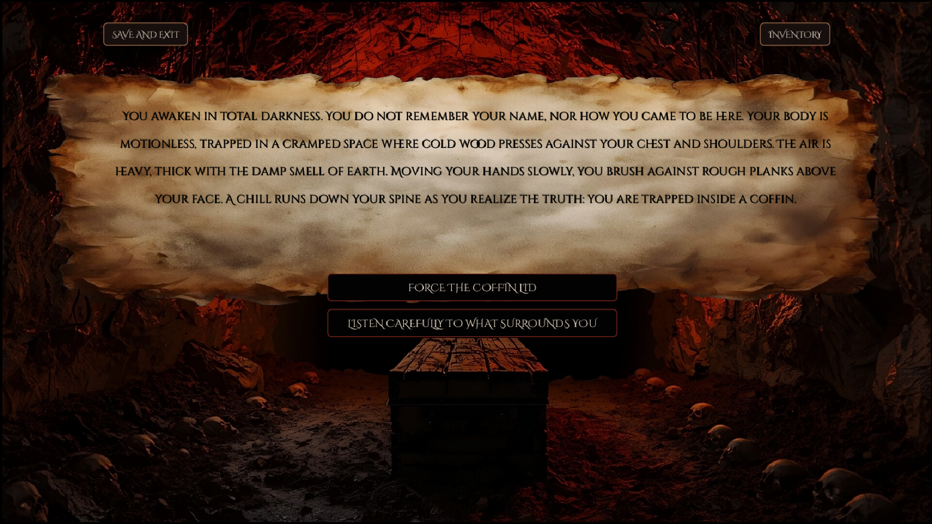 Text-based horror with meaningful choices: wake up in a coffin, explore the darkness and survive rituals, puzzles and hidden entities.