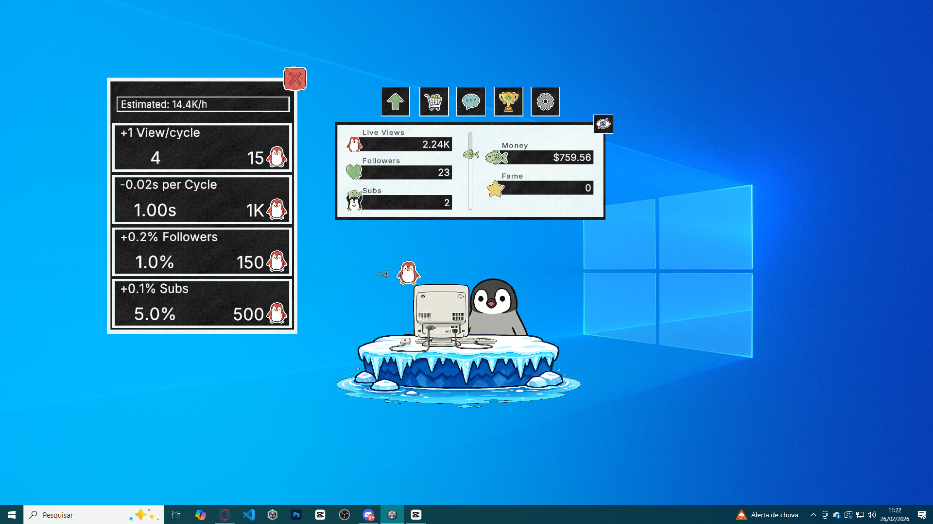 Kinguin is a relaxing idle simulator about a penguin streamer. Leave the game in the corner of your screen while you work, upgrade your setup to turn views into valuable followers and subs, and climb the Global Rank. Dominate the algorithm and become the internet's greatest polar legend!