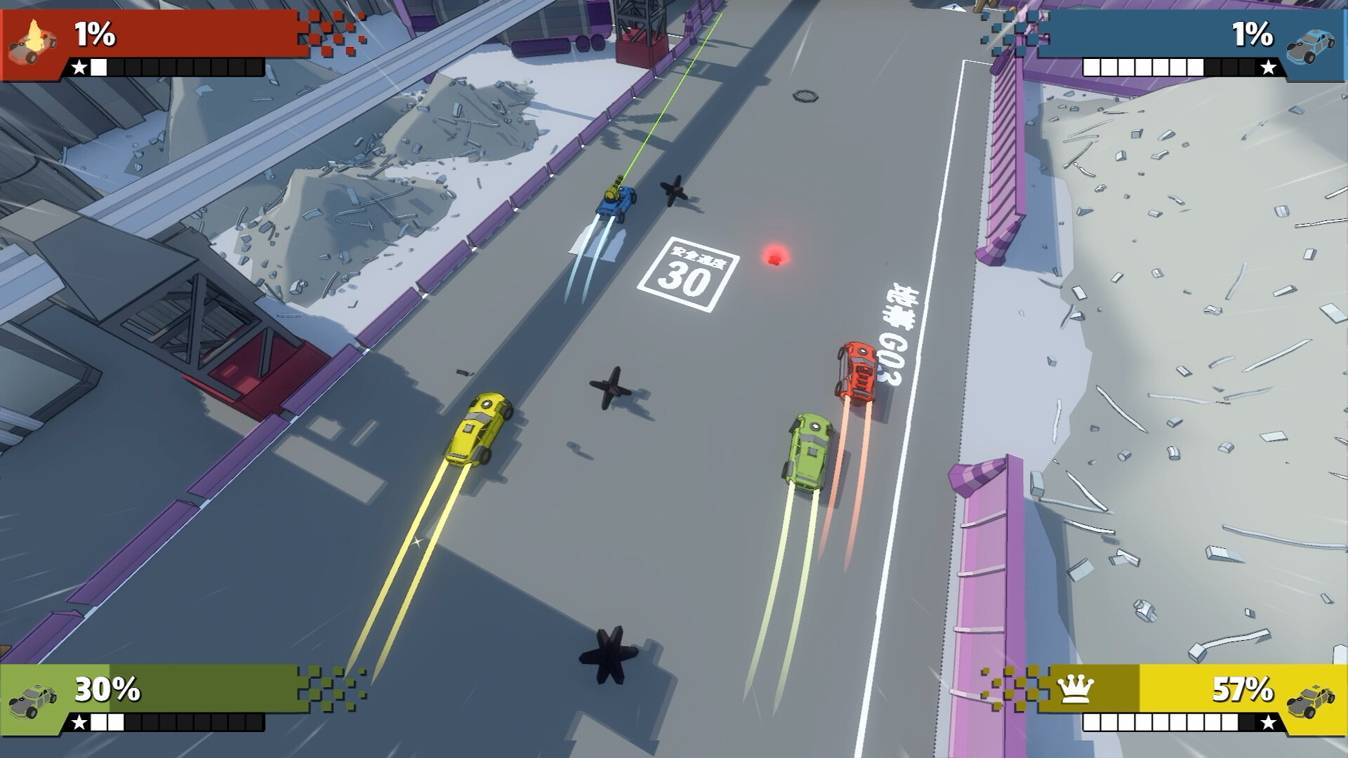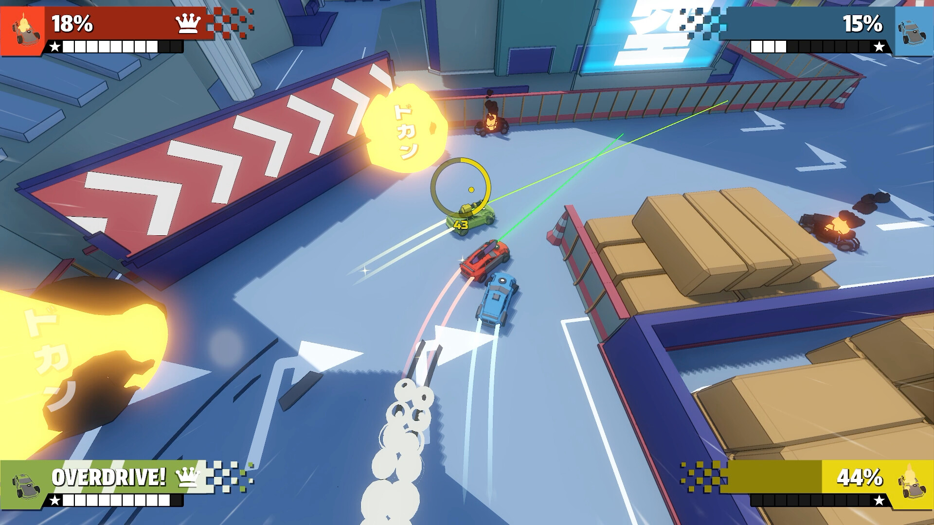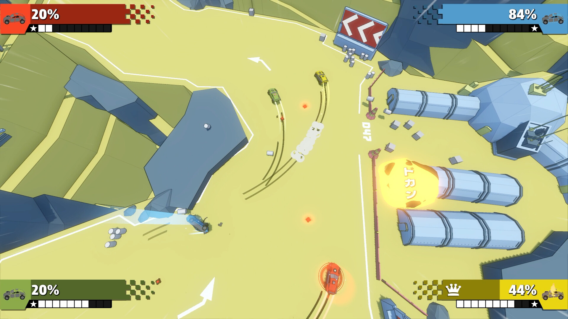 Compete in a tournament of short, chaotic sprints. Anyone who falls too far behind is eliminated, but can still have a big impact with homing missiles. An old-school game that can fill entire evenings and end friendships.