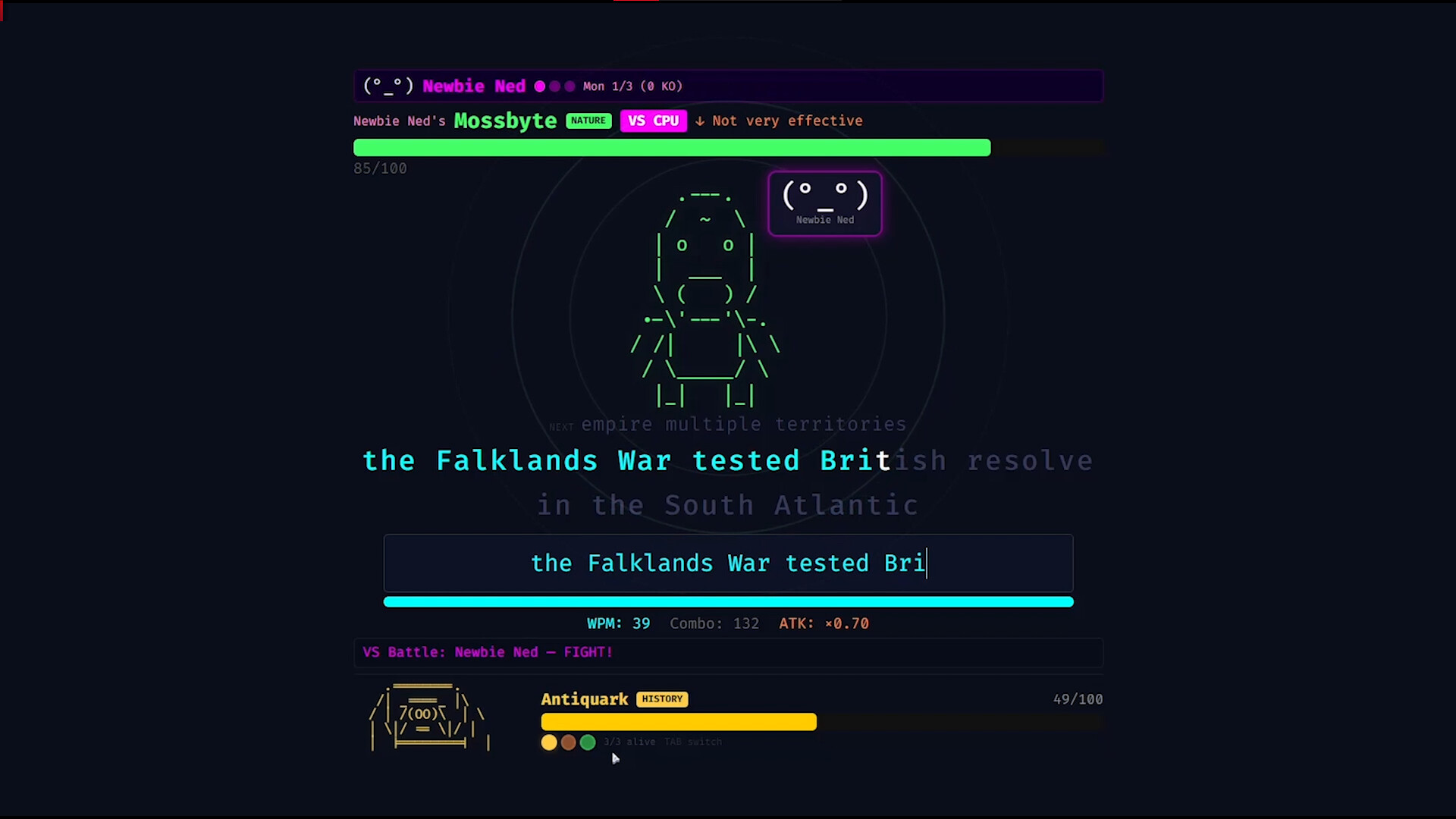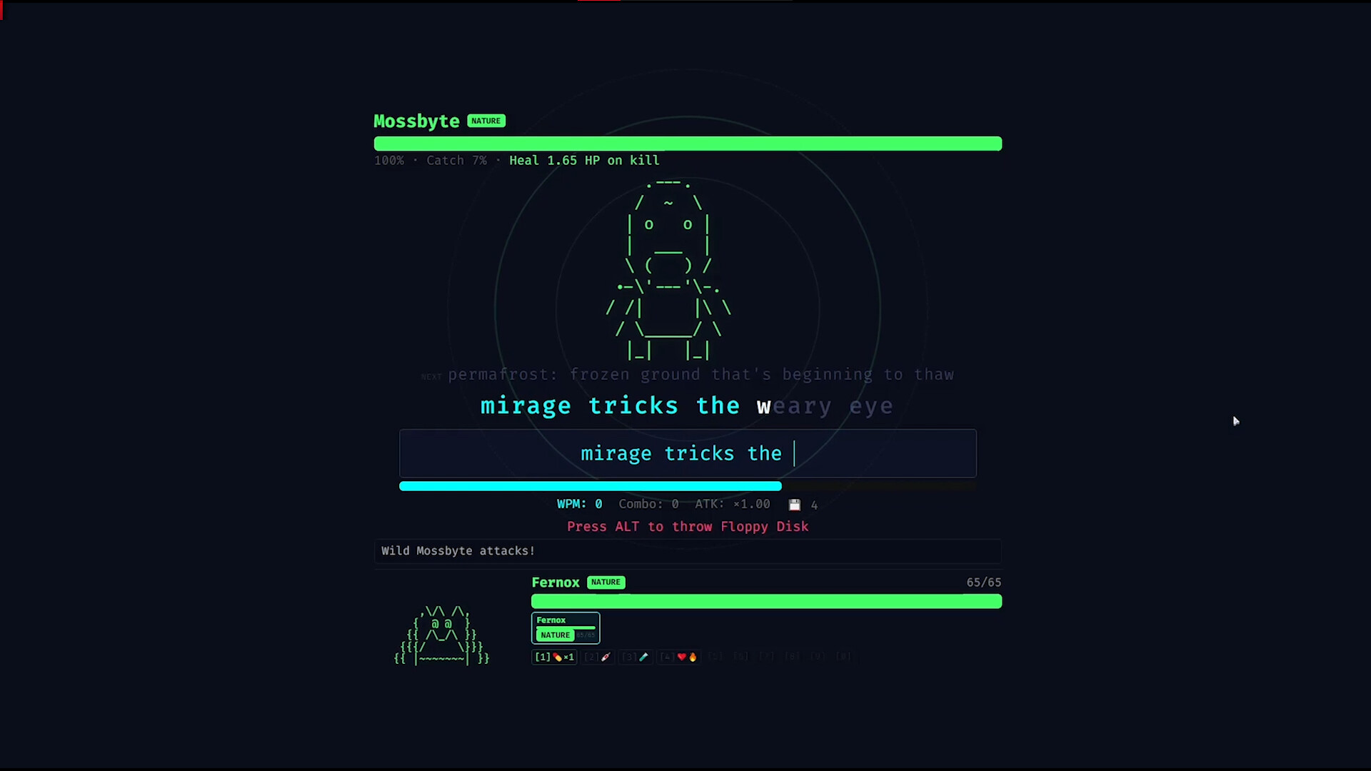 A typing roguelike monster collector where every keystroke is combat. Type sentences to battle and catch 88+ species of Typomon, explore procedural dungeons, evolve your team, forge words, fuse hybrids, and climb the VS Battle ladder — all powered by your words-per-minute.