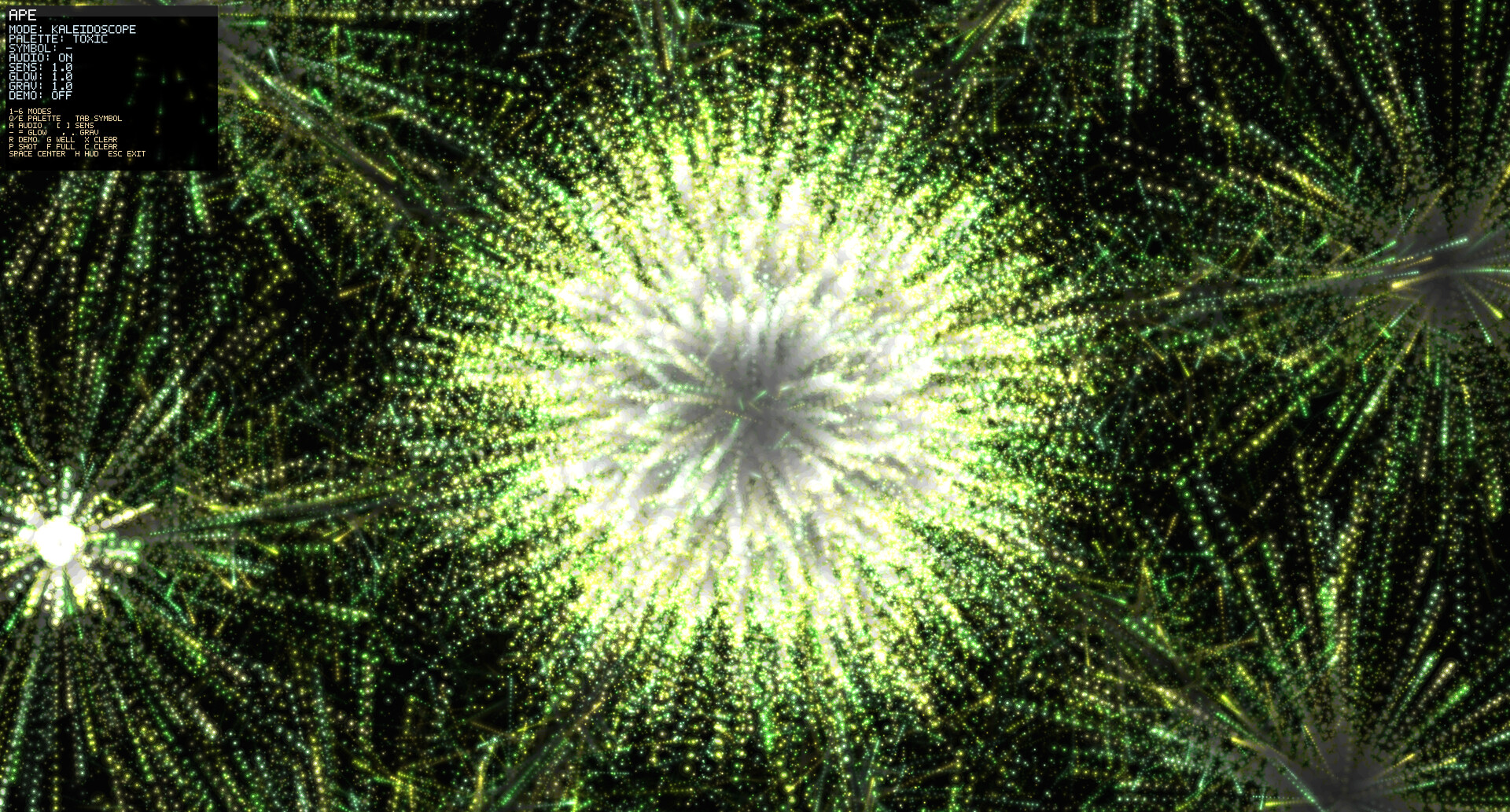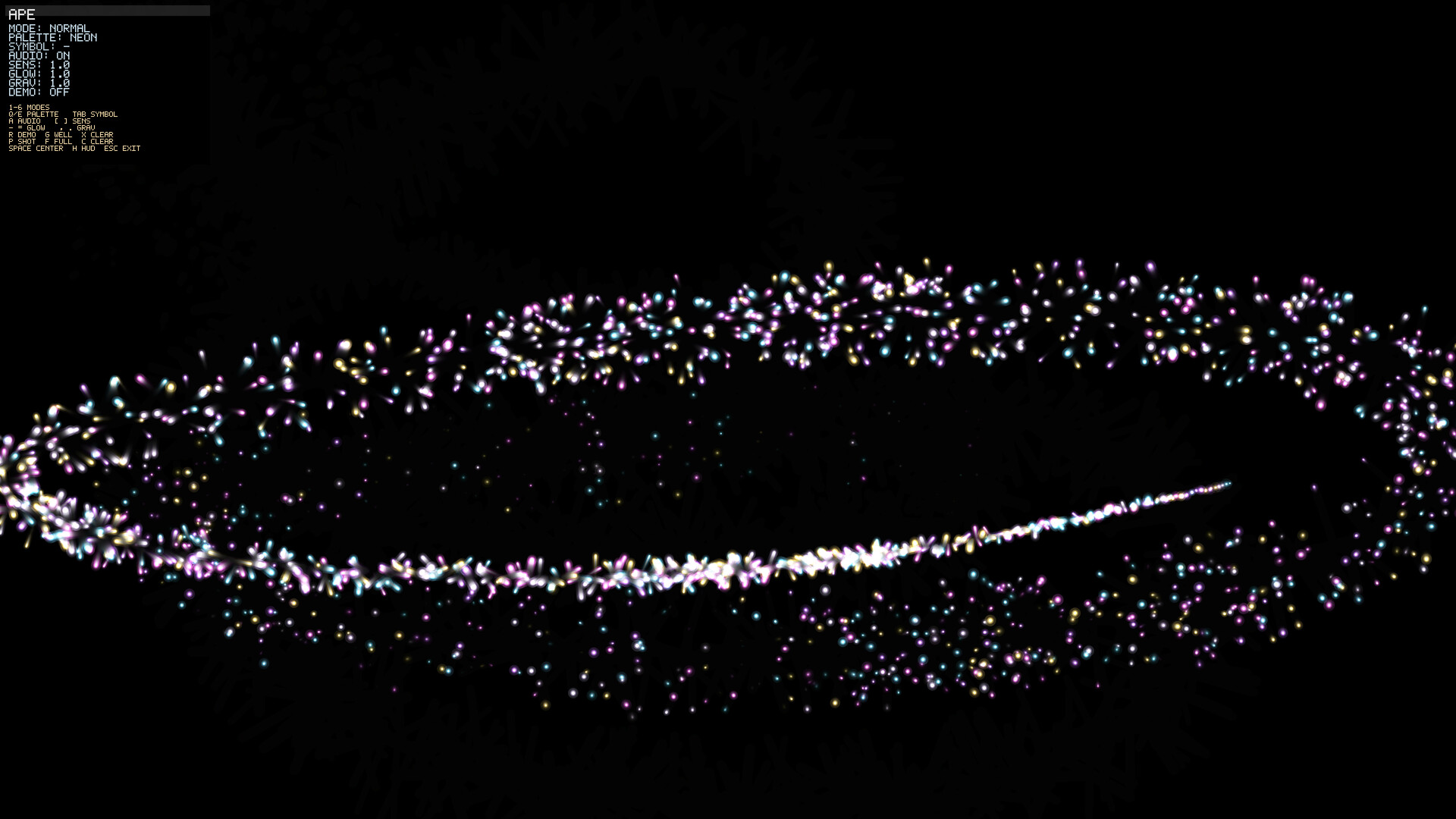 Atomic Particle Engine (APE) is an interactive particle sandbox and music-reactive visualizer. Create explosive particle effects, generative patterns, and abstract visuals that respond to your input and audio in real time.