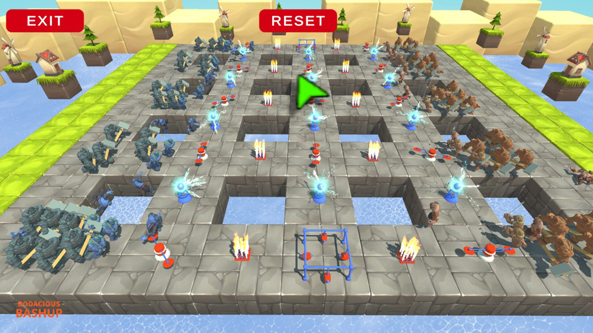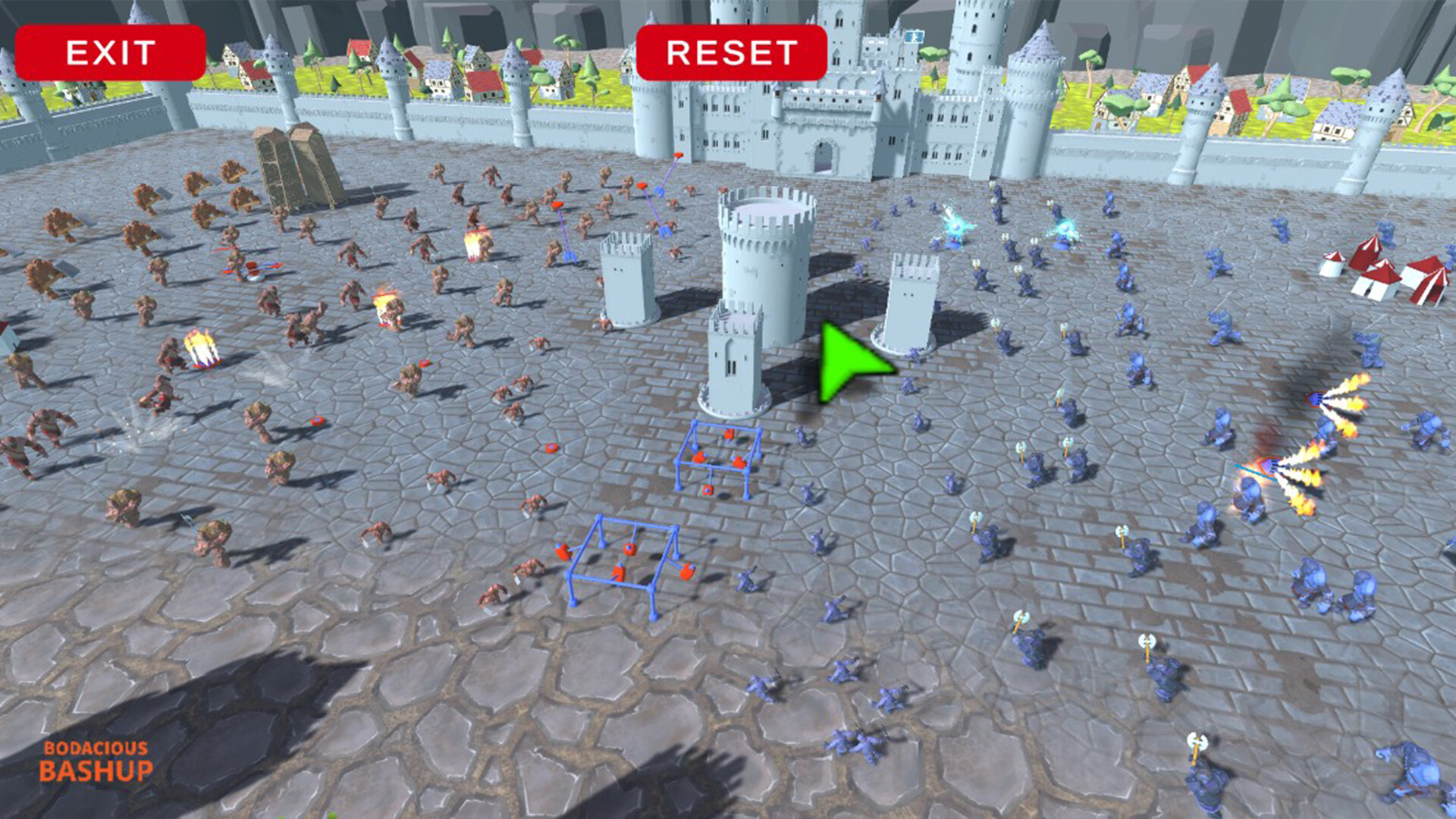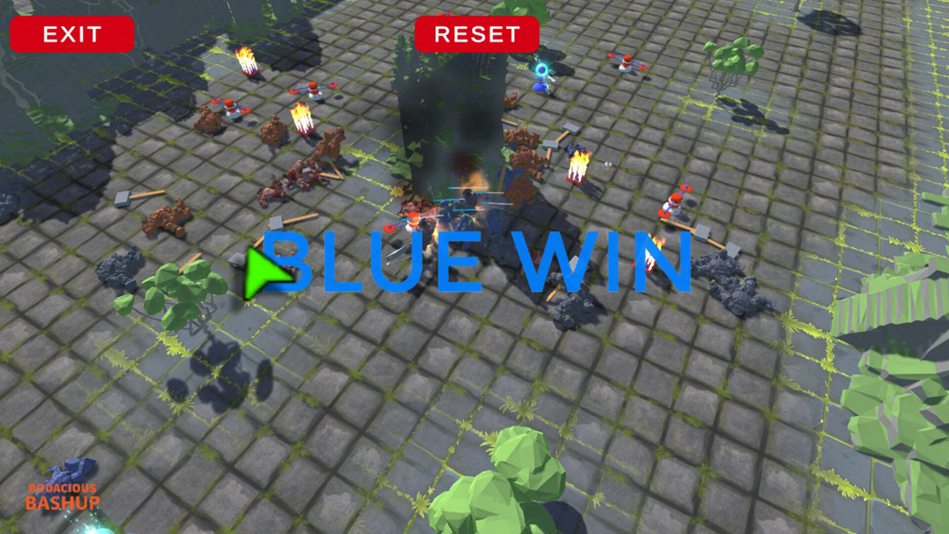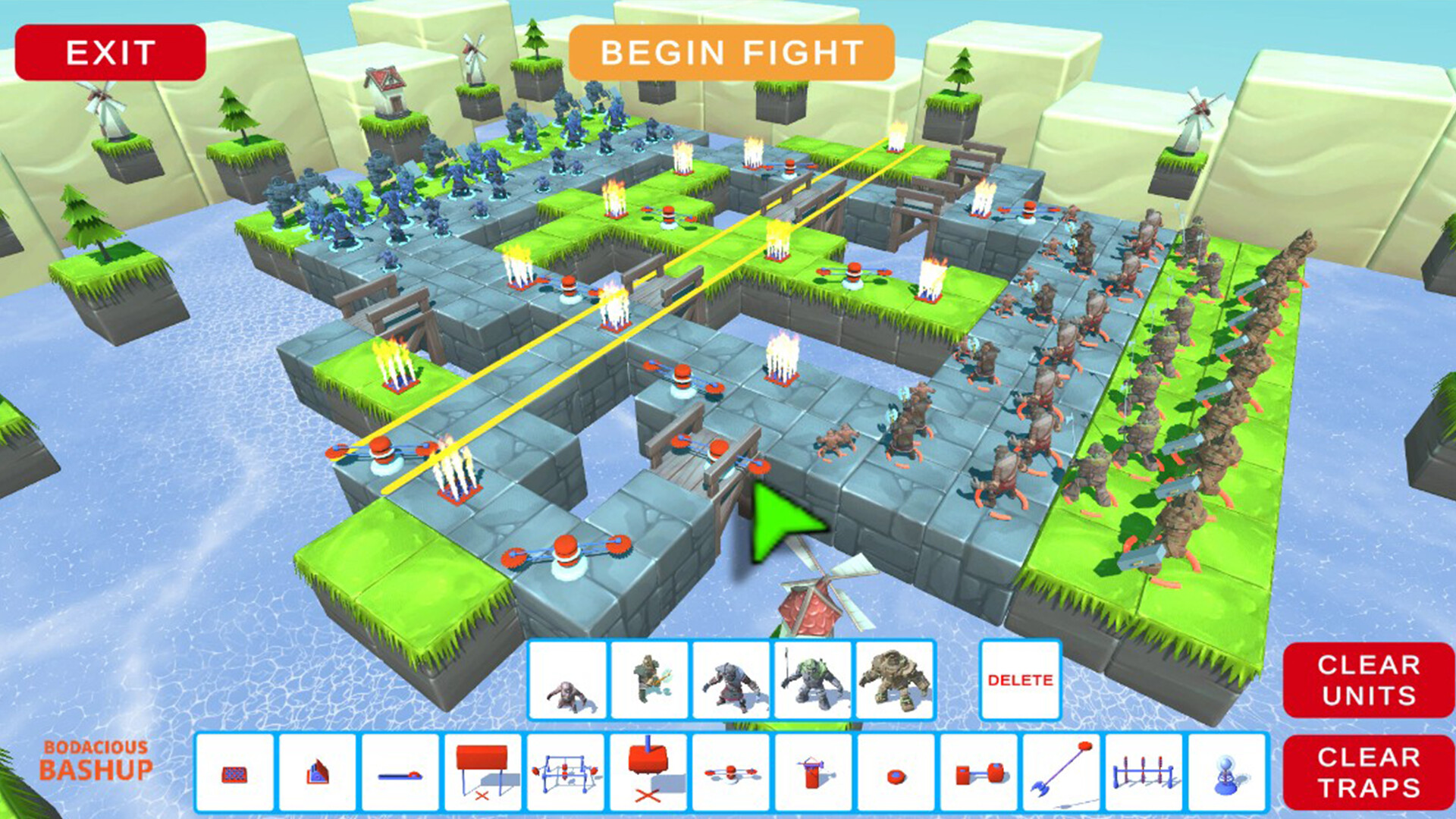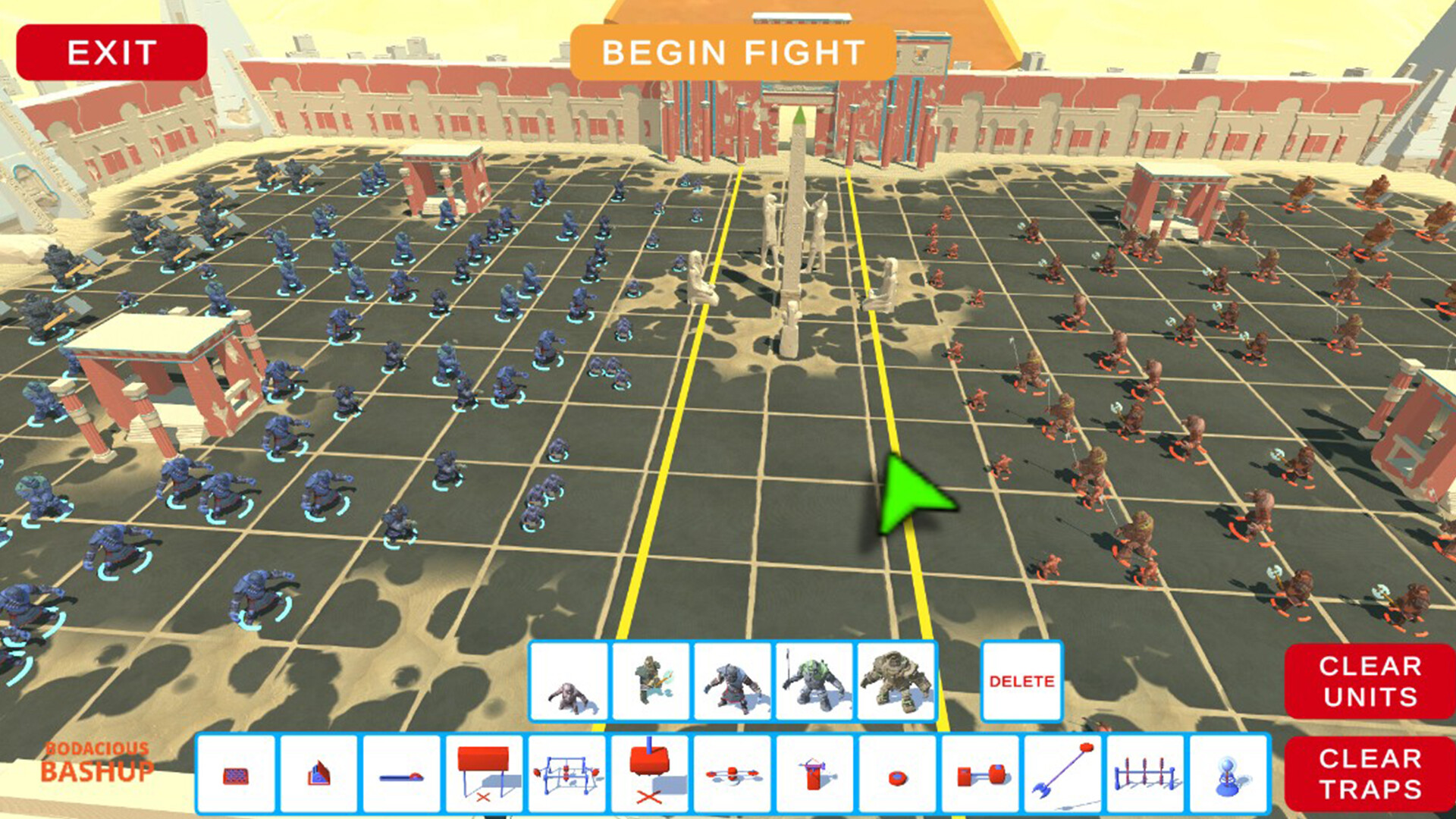Bodacious Bashup is a battle simulator with both open and bottle-necked battlegrounds. Easily place down NPC's and traps and begin the round to watch both teams fight and fall into traps in realtime. Red and Blue will fight to the death - but only one will win.