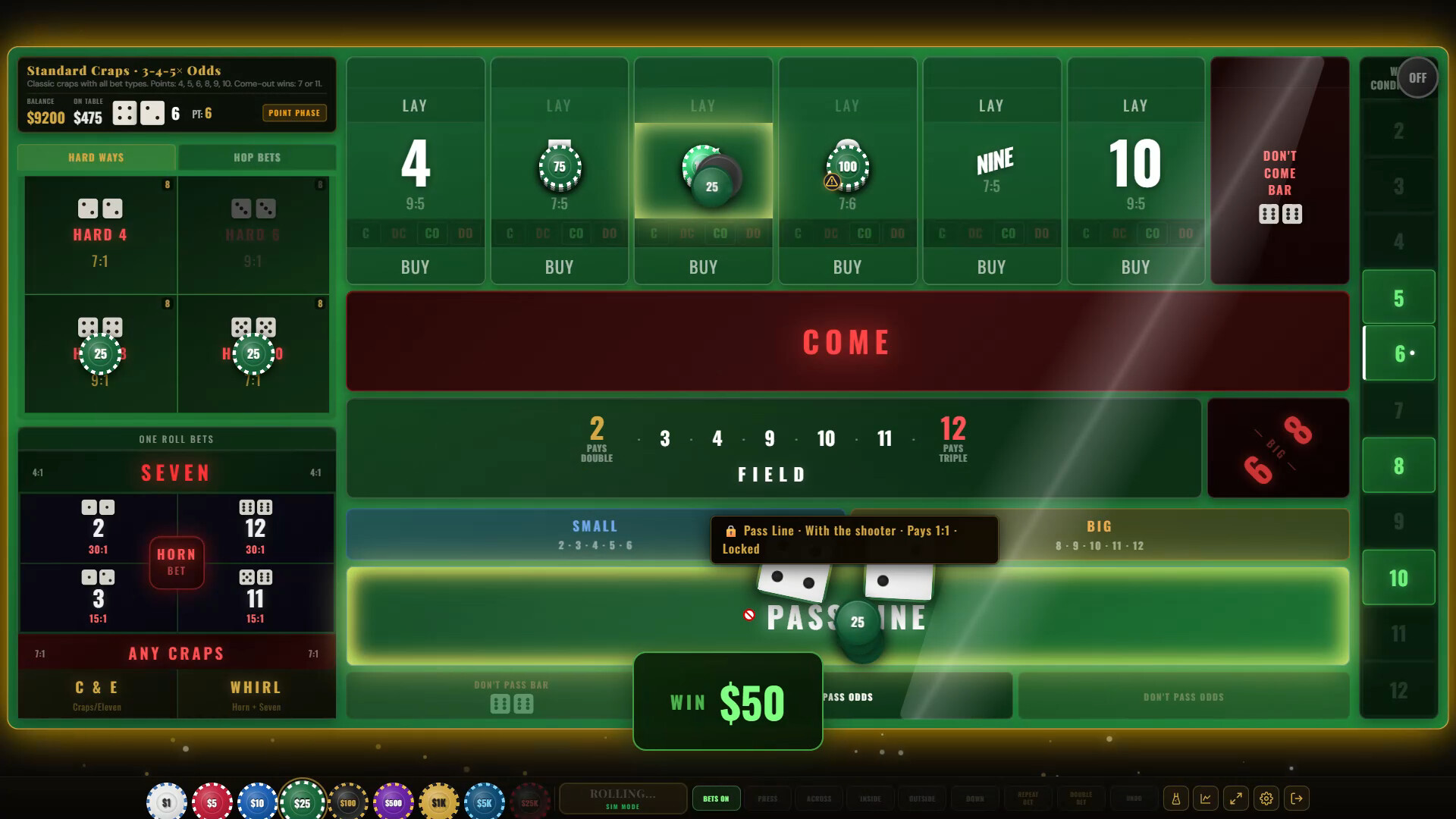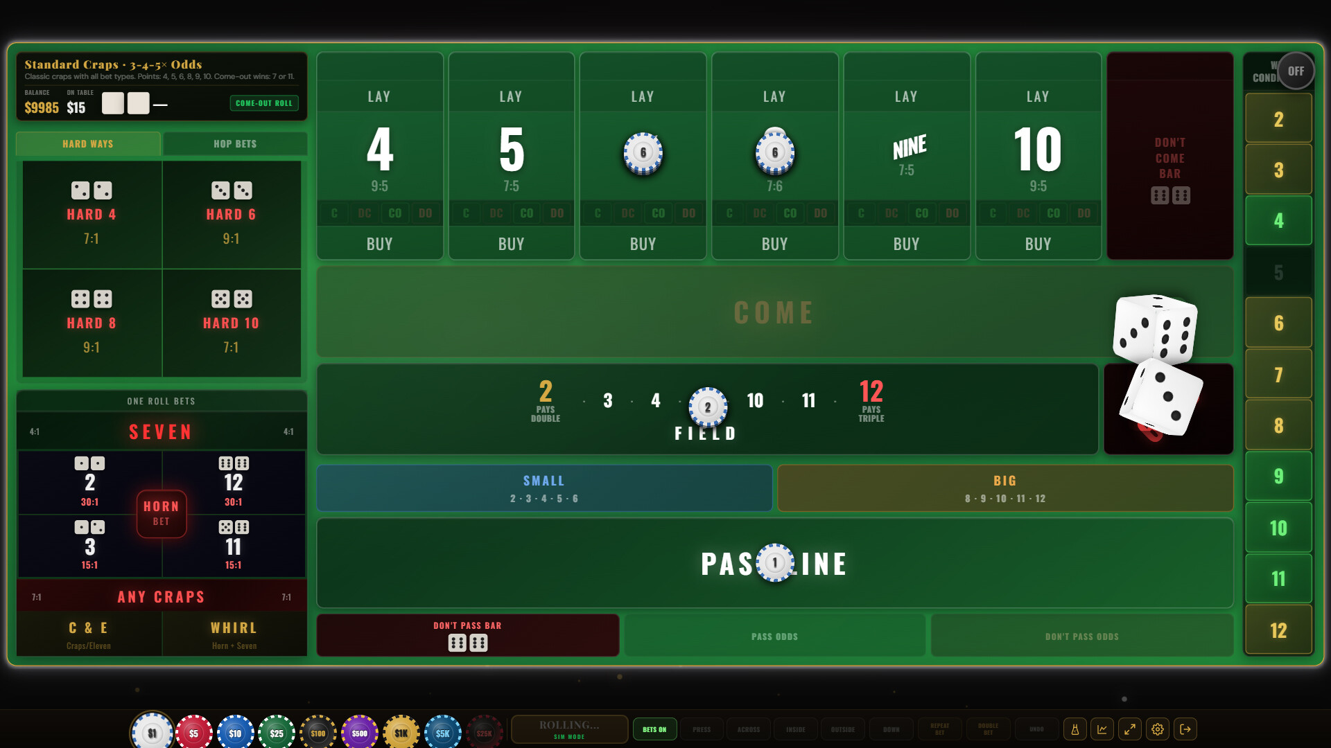 The most complete craps simulator ever built. 3 variants, 42+ bet types, real stickman voice calls, and the Dice Lab — force any roll, bias the odds, simulate table streaks. Export every session to CSV. A craps table with an X-ray machine attached. Master the math. Own the table.