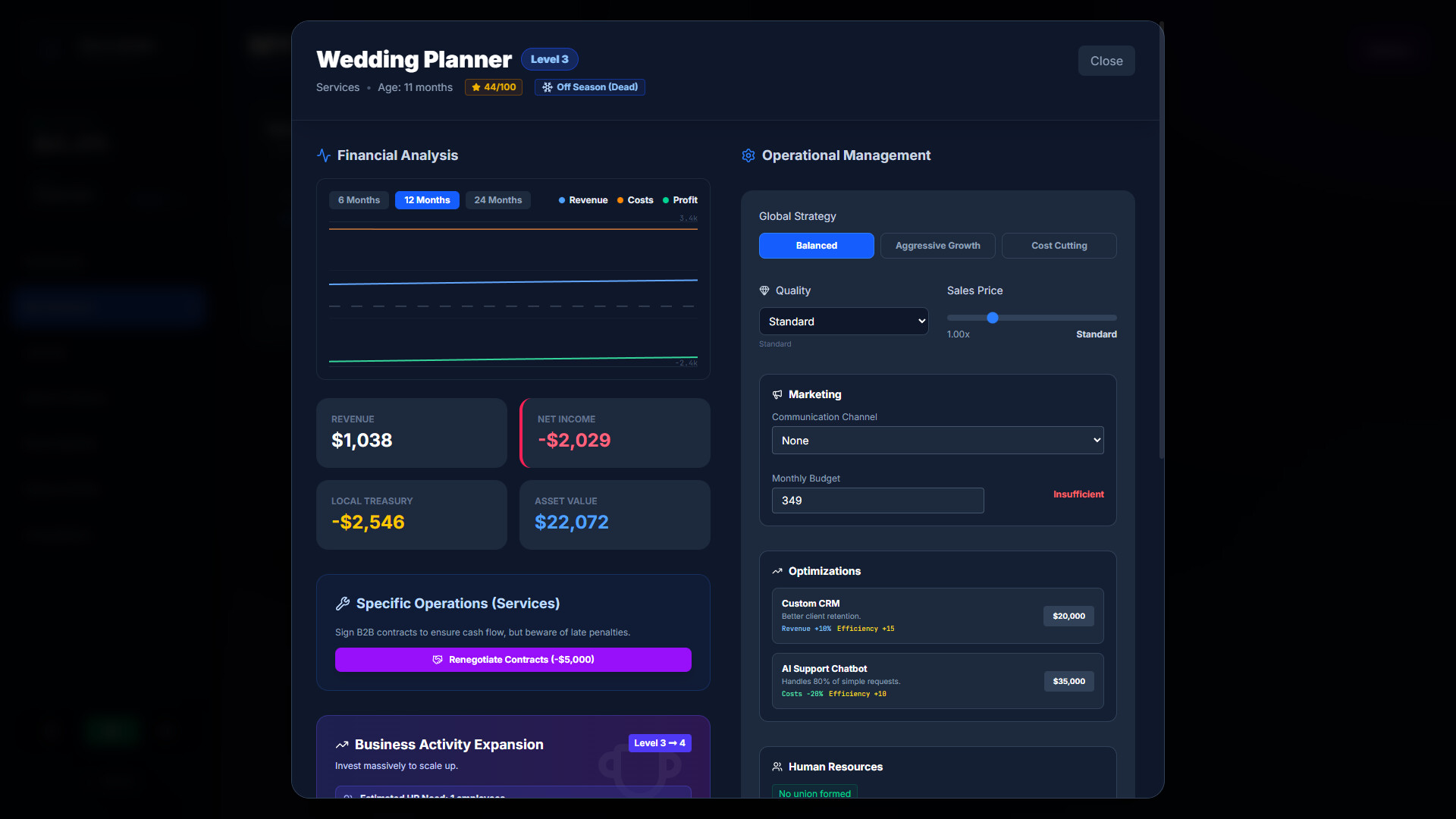 Global Business Tycoon is a strategic management simulator where you build a global empire. Play solo or online multiplayer with up to 8 players.