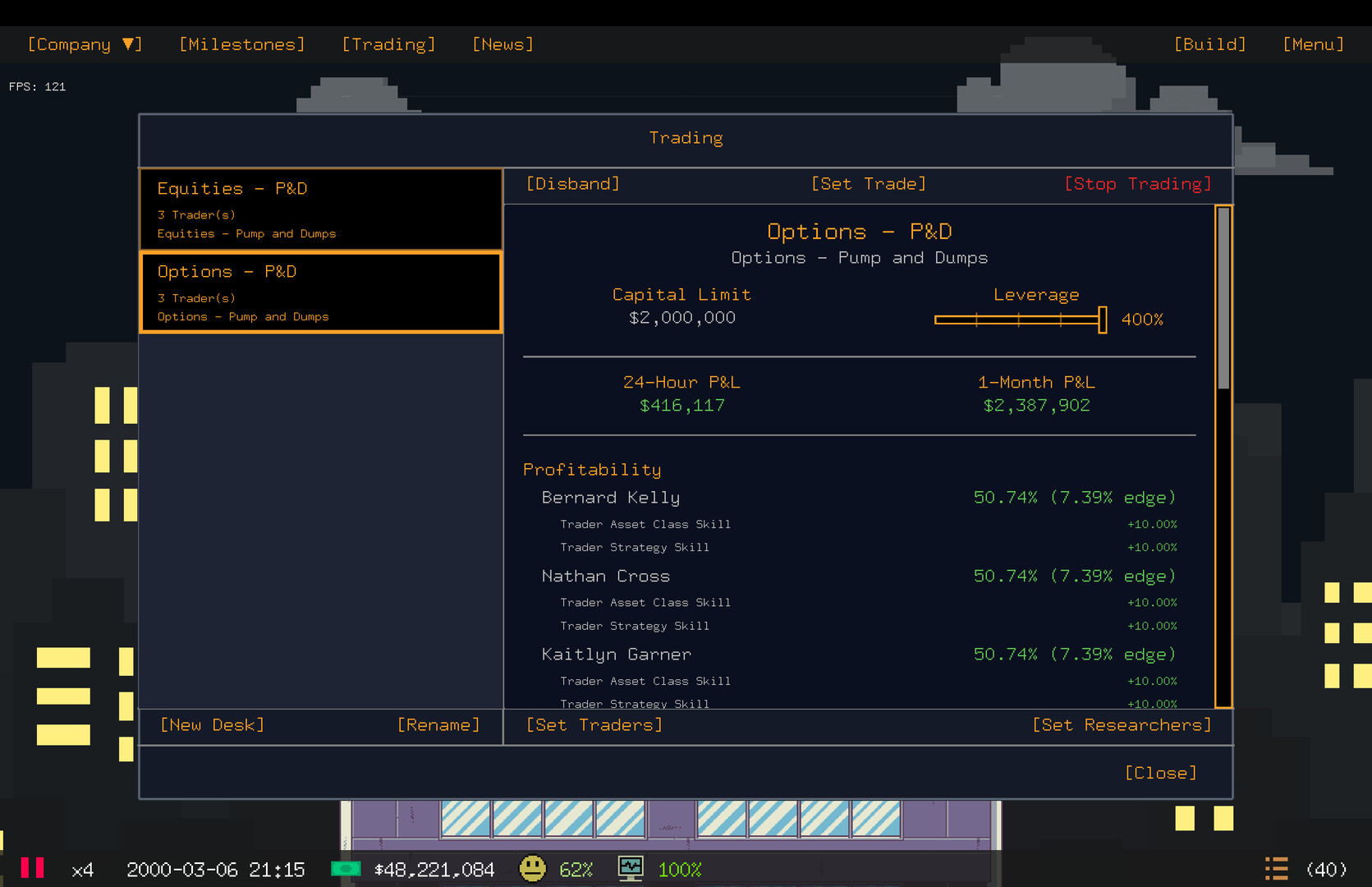 Grow a trading firm from your apartment to a global institution. Hire traders and engineers, research new strategies, negotiate with your competitors, optimize your infrastructure, and build the most successful proprietary trading firm on Wall Street!