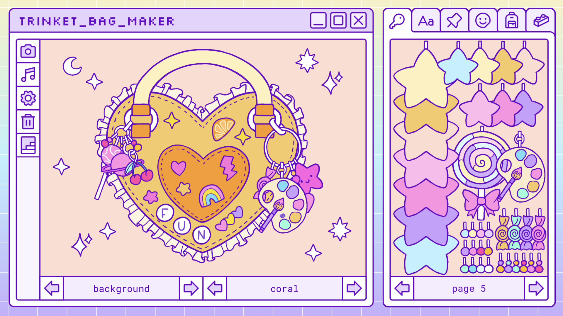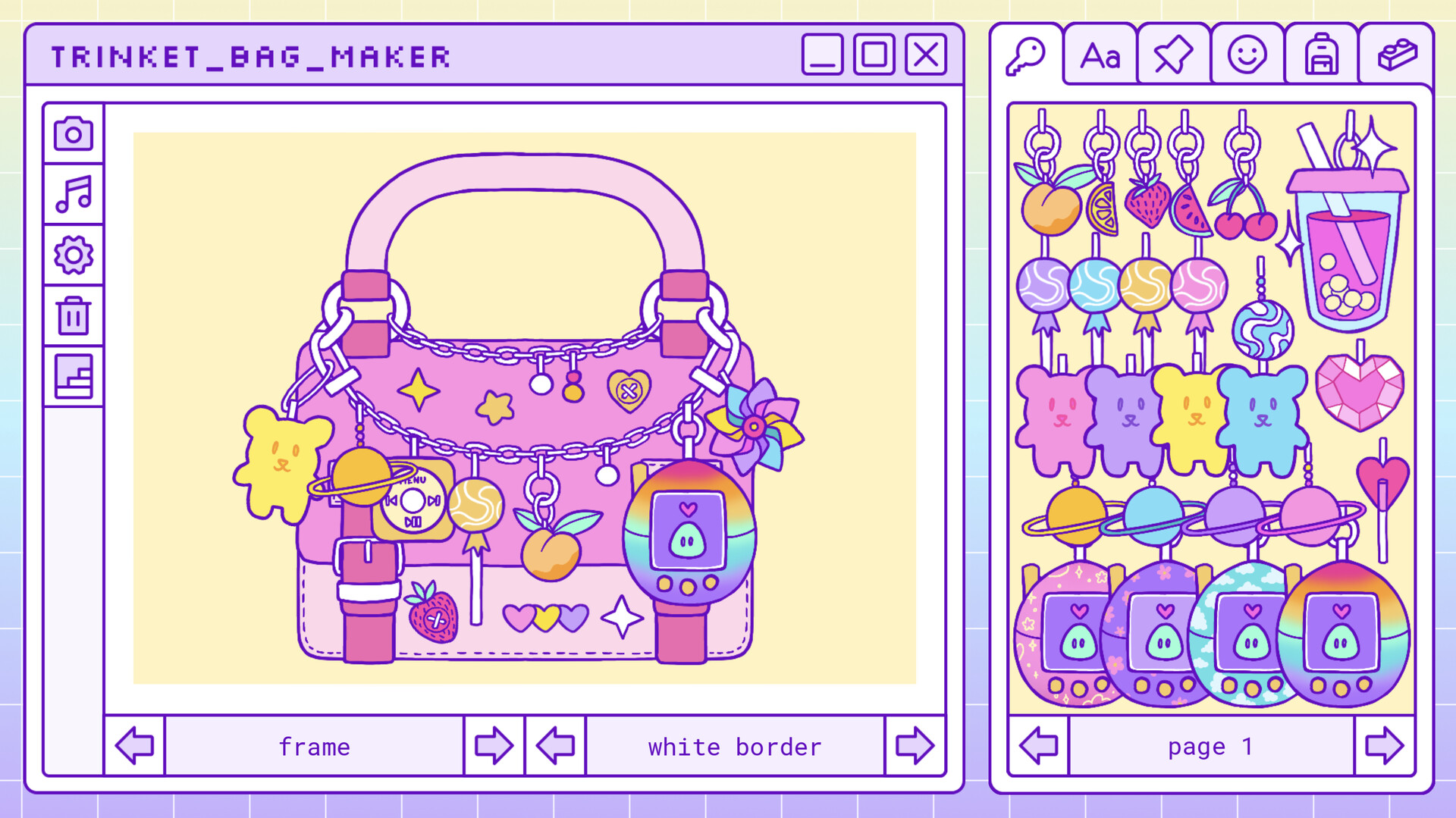 Trinket Bag Maker is a cozy retro sandbox game inspired by the 2000's girl games, where you can create your own trinket bag! Choose between many adorable charms and bags to create the trinket bag of your dreams! ✨