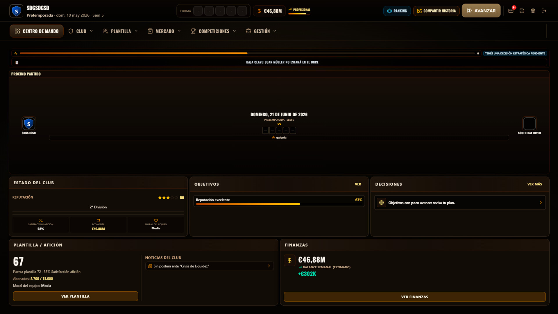 Become the president of your club and make decisions that change its destiny. Manage transfers, staff, finances, media, facilities, and the president's personal life in a deep and dynamic football management experience.