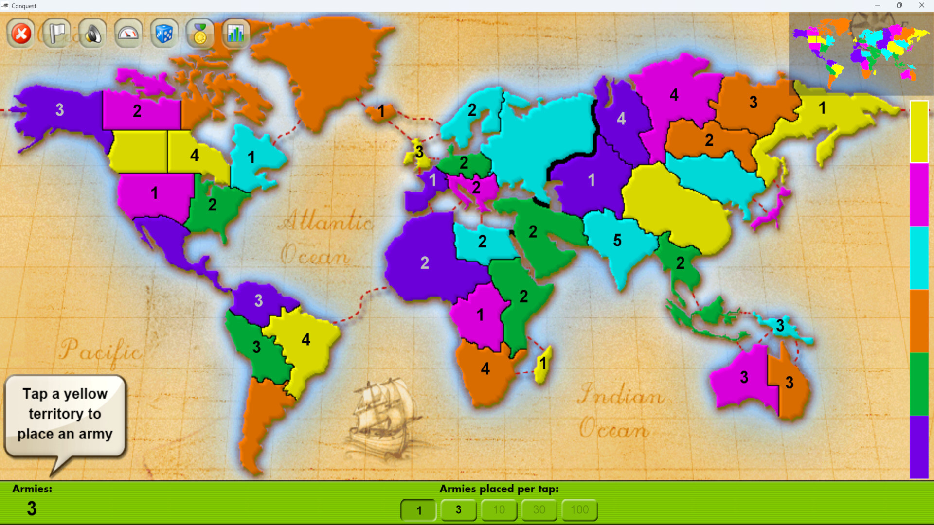 Conquest is a strategy board game where you fight against up to 7 computer or human controlled opponents to take over the world before you are eliminated by your enemies. The results of combat are calculated using dice throws for attackers and defenders.