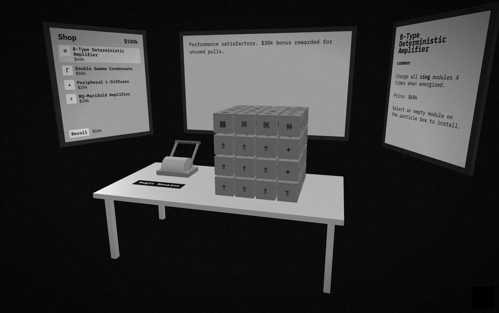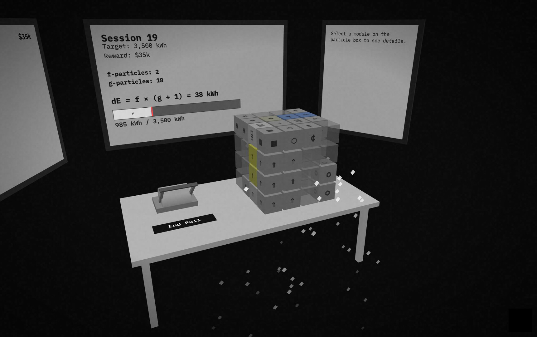 A strategic incremental game about using scientific-sounding probabilistic particle interactions to make a number go up. Generate quettawatt-hours of electricity in the Particle Box room and get promoted to Senior Staff Intern.