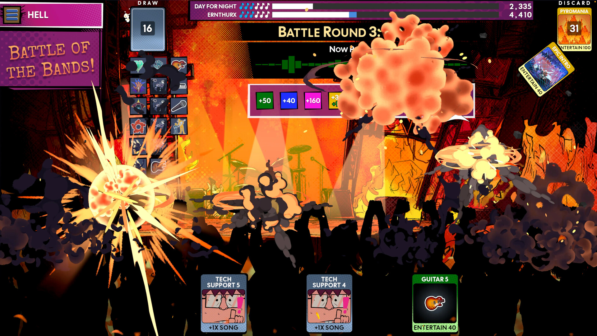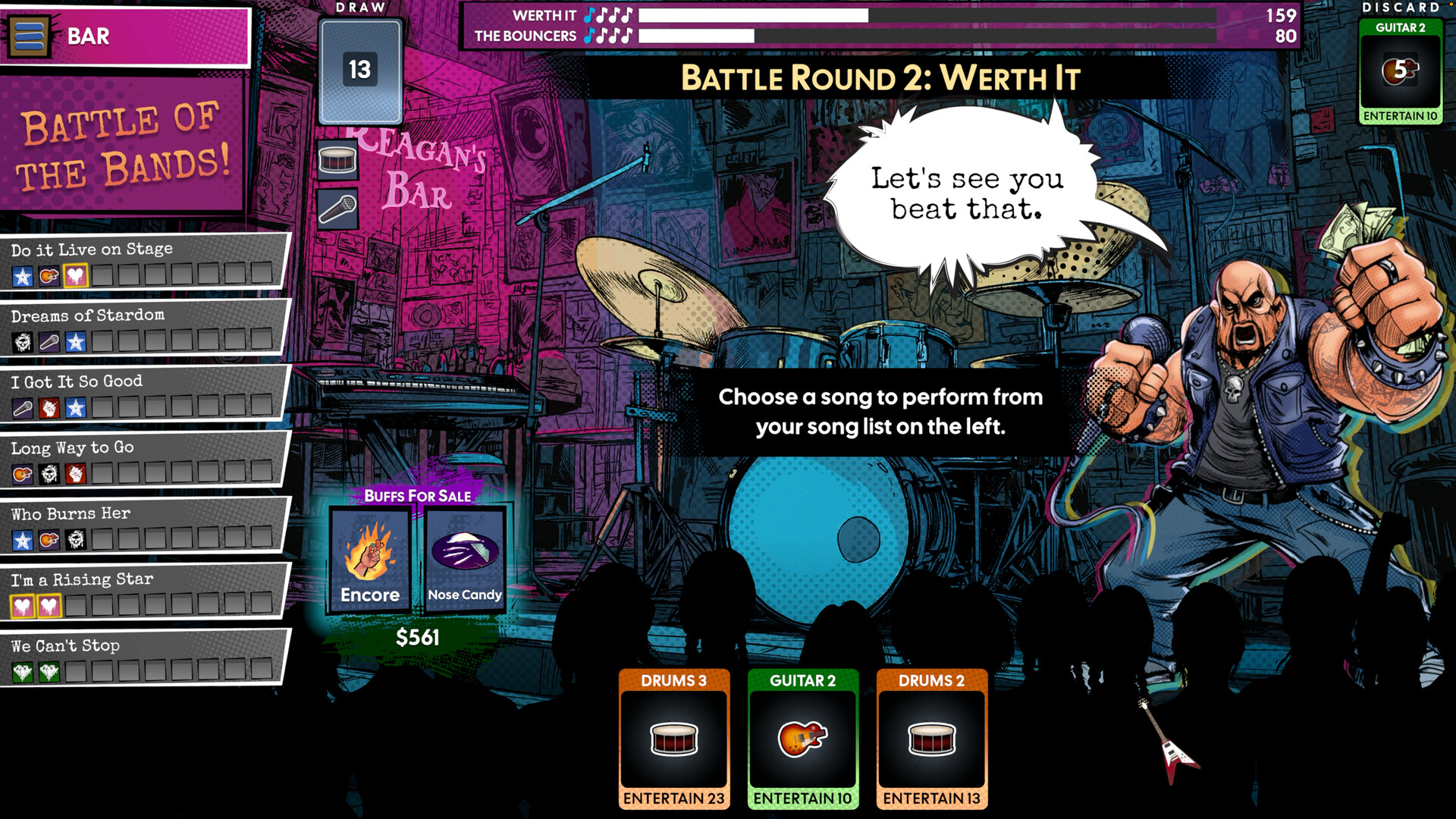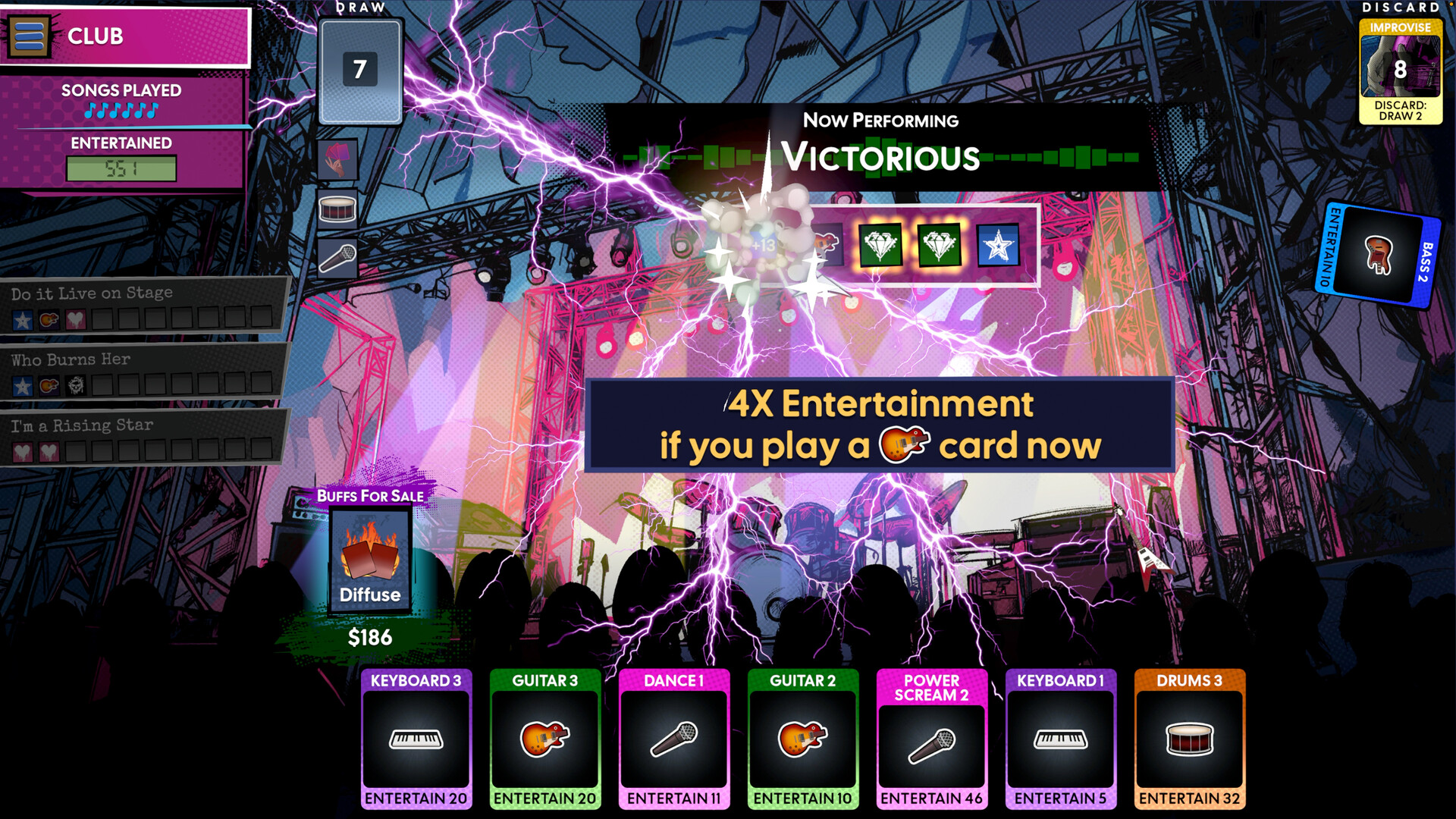 From the developer of the Shady O'Grady's™ Rising Star series comes a band sim game with more attitude than a teenager hyped up on energy drinks. This roguelike deckbuilder lets you step into the shoes of a startup rock band - write songs, buy instruments, and play gigs from bars to festivals.