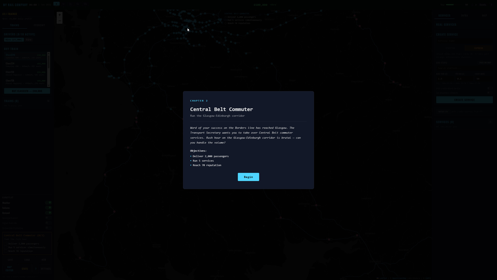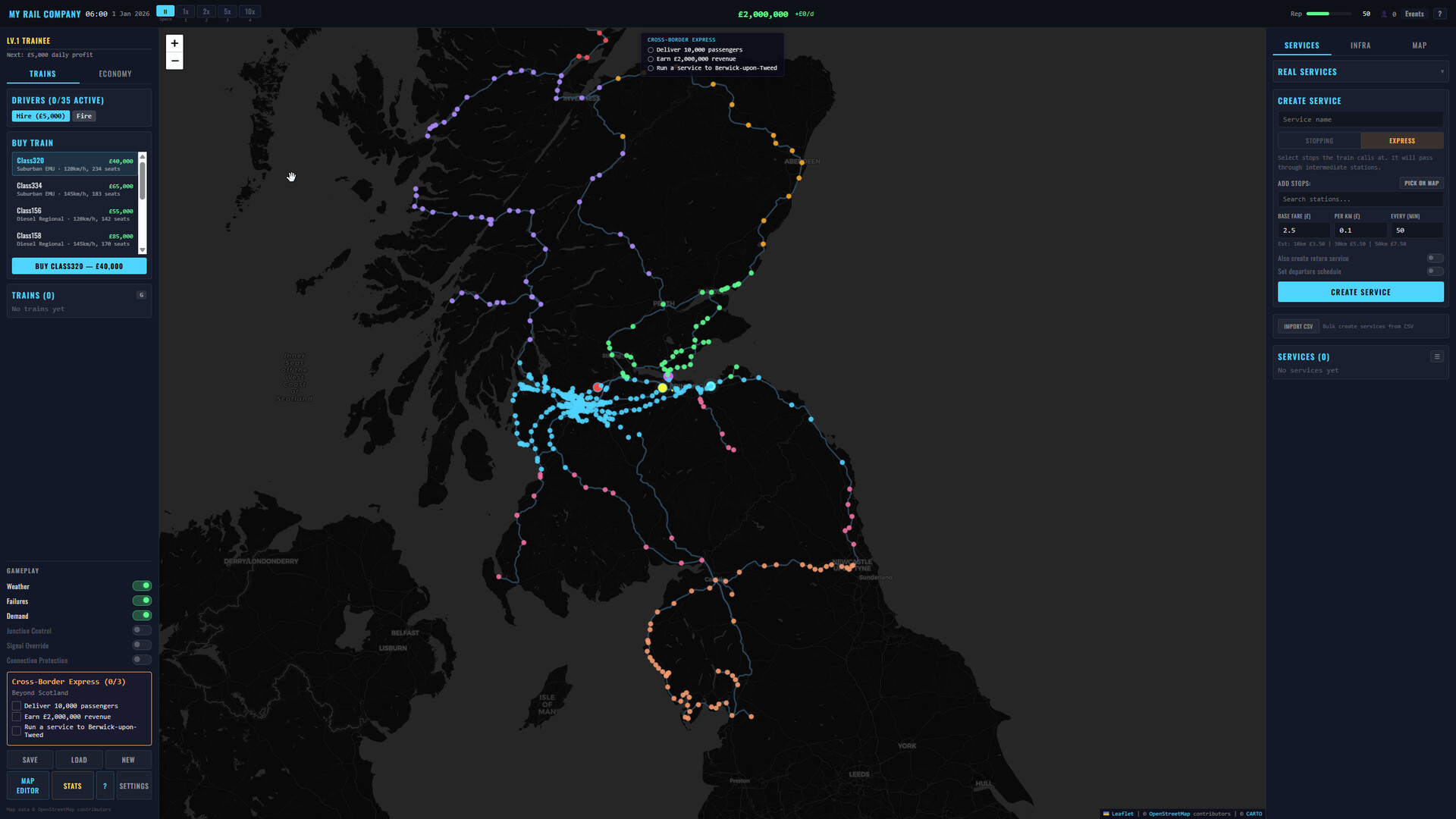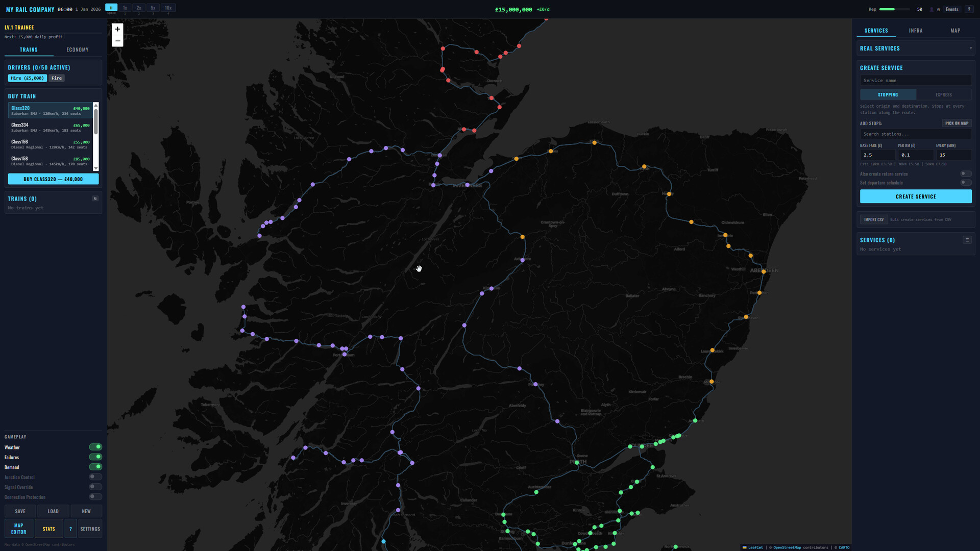 Build and manage your own railway empire. Buy trains, create services, expand the network, and grow from a single branch line. Map your own routes, or play across the real UK rail network and beyond.
