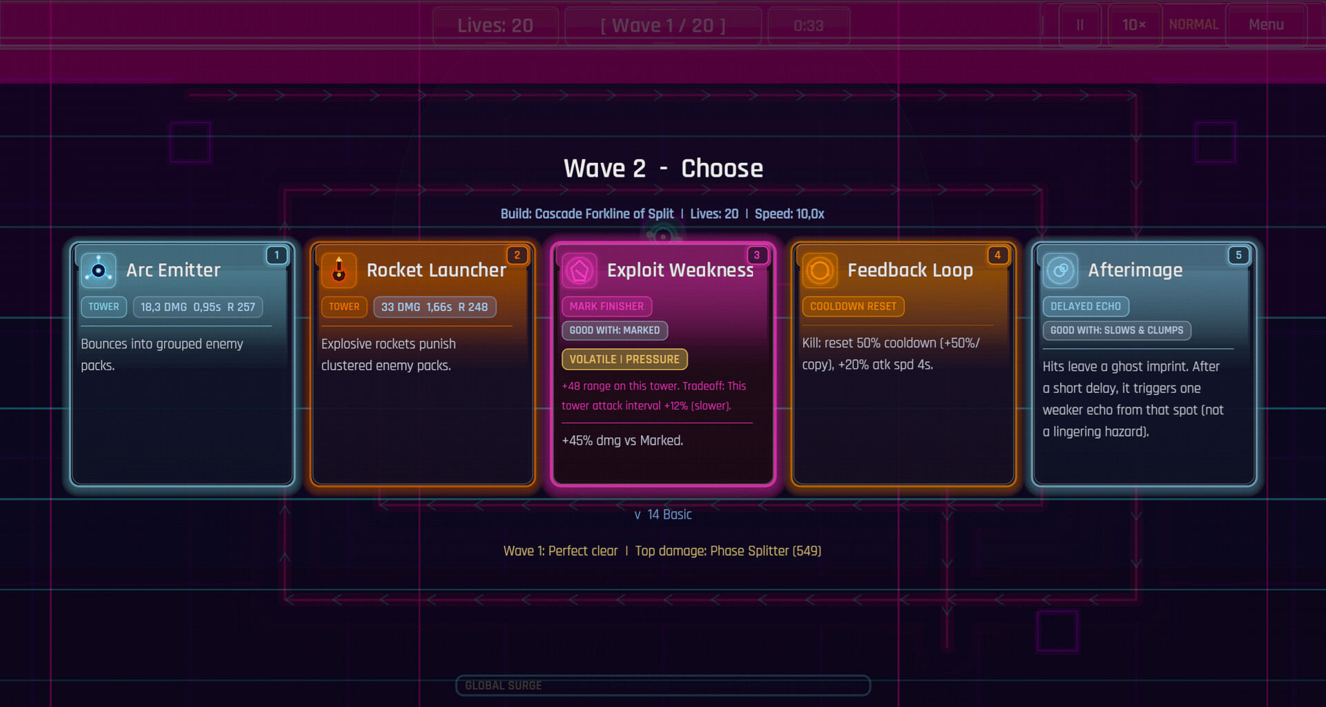 Pick 1 tower, modifier or upgrade every wave. Stack insane tower synergies and watch your build spiral out of control.