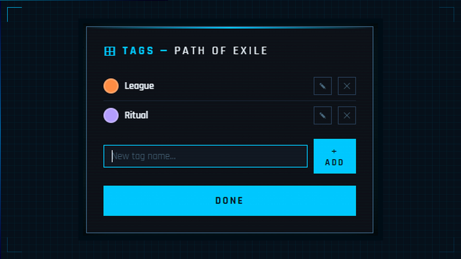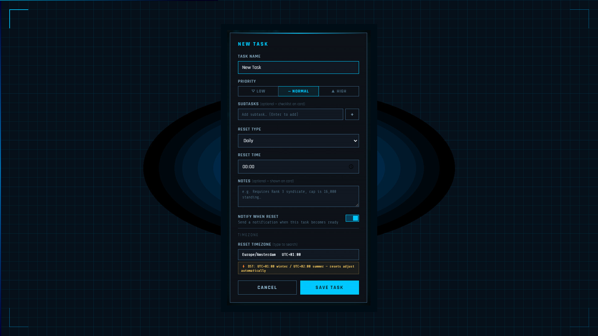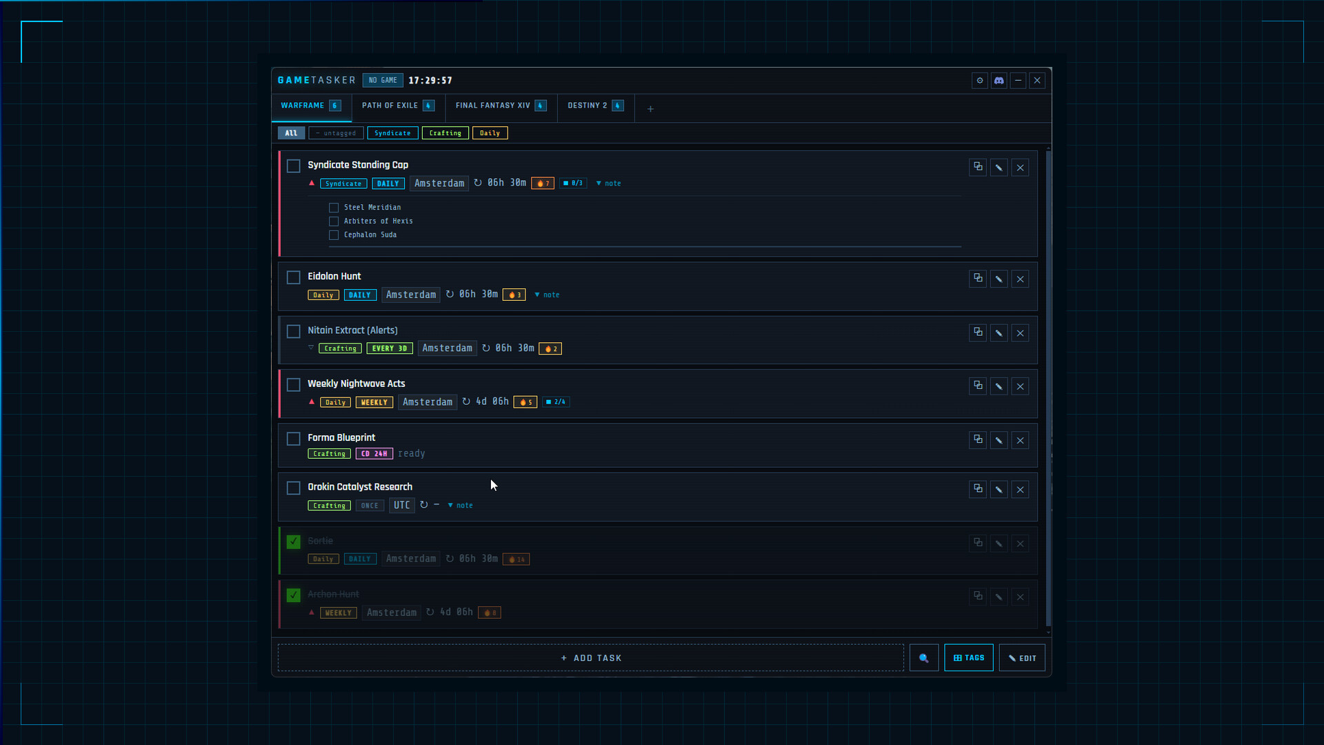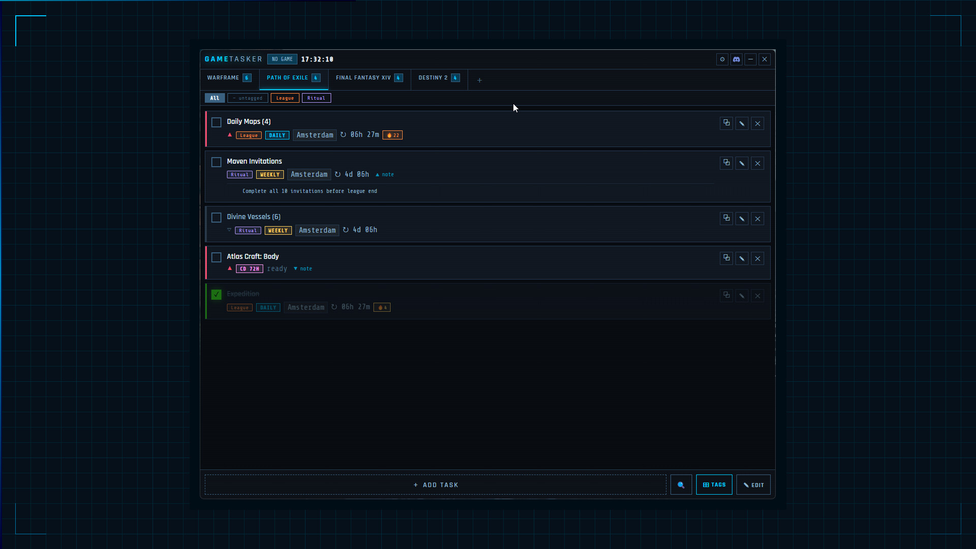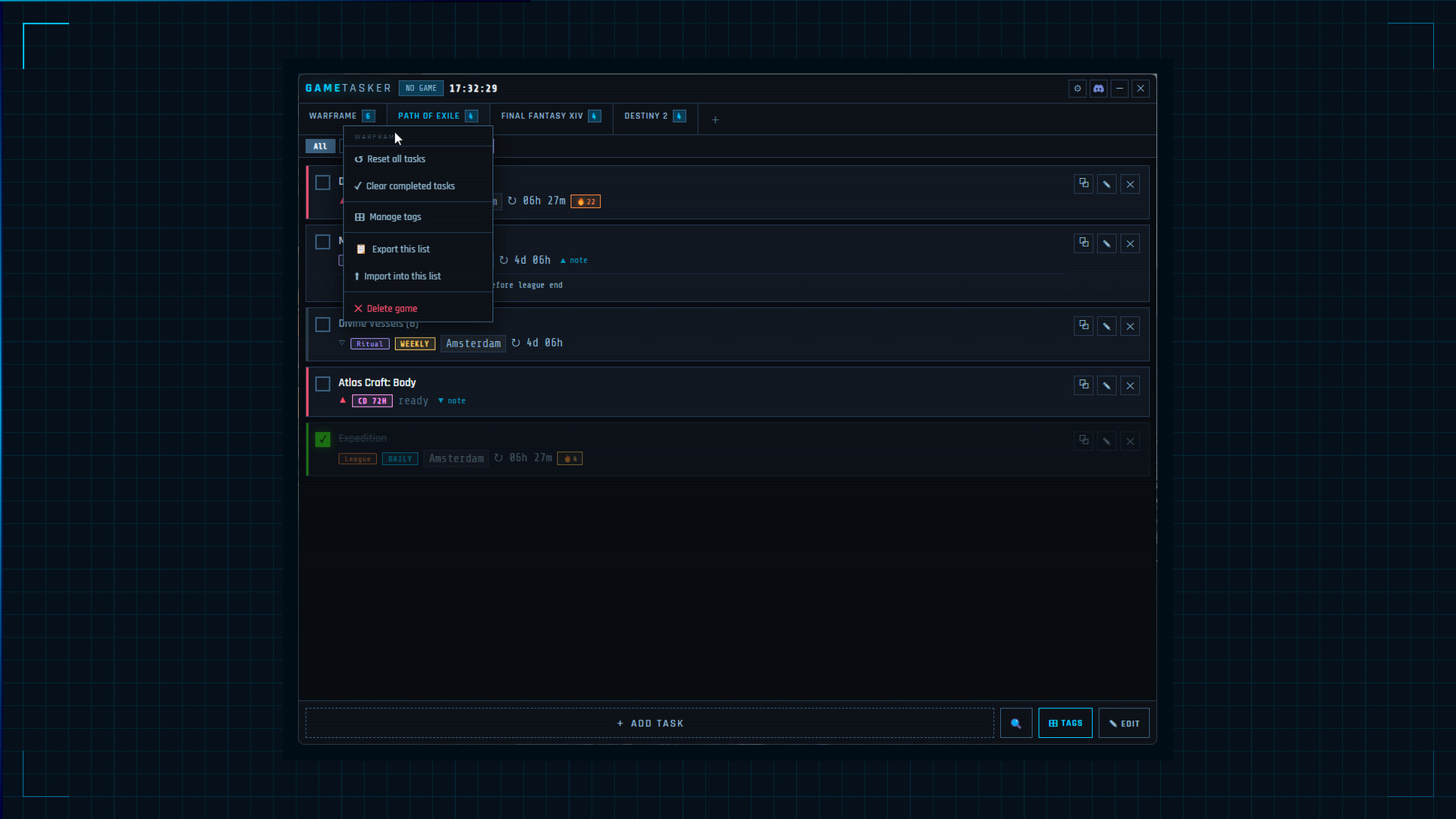 Per-game task tracker with scheduled resets. Track your dailies, weeklies, cooldowns and more — one tab per game, always on top while you play.