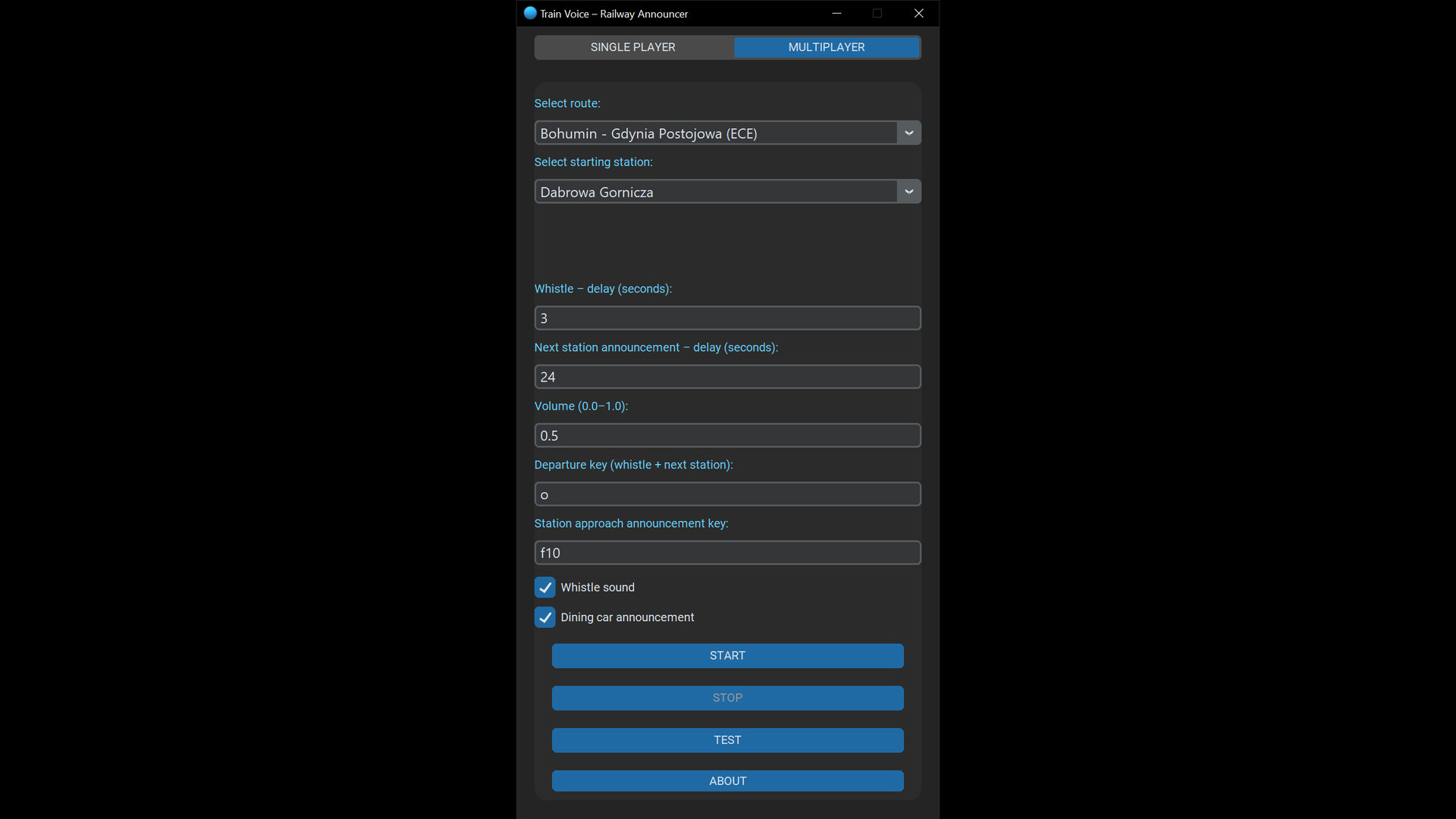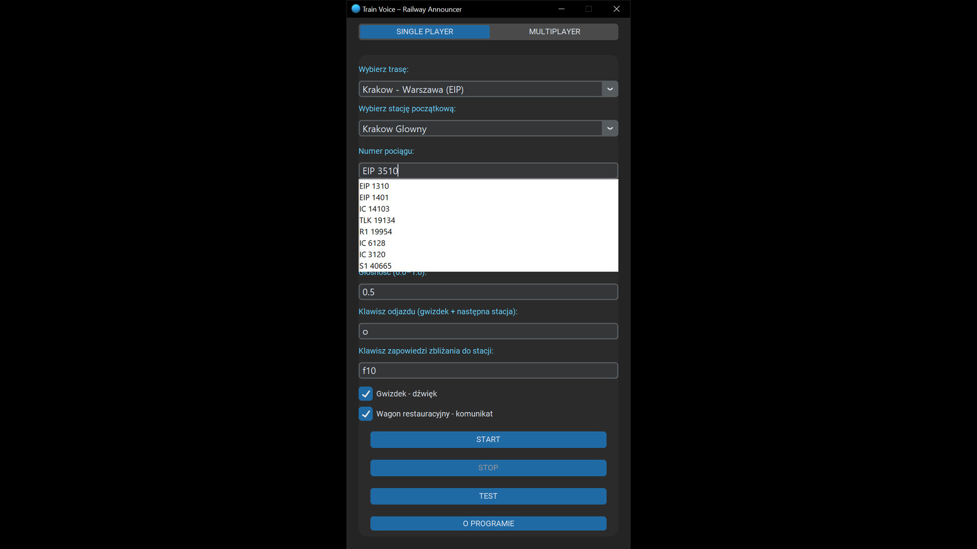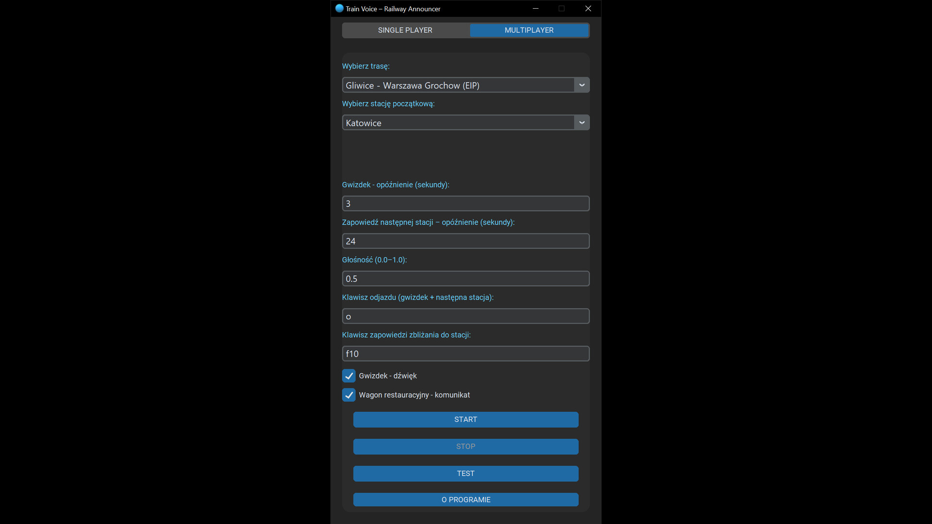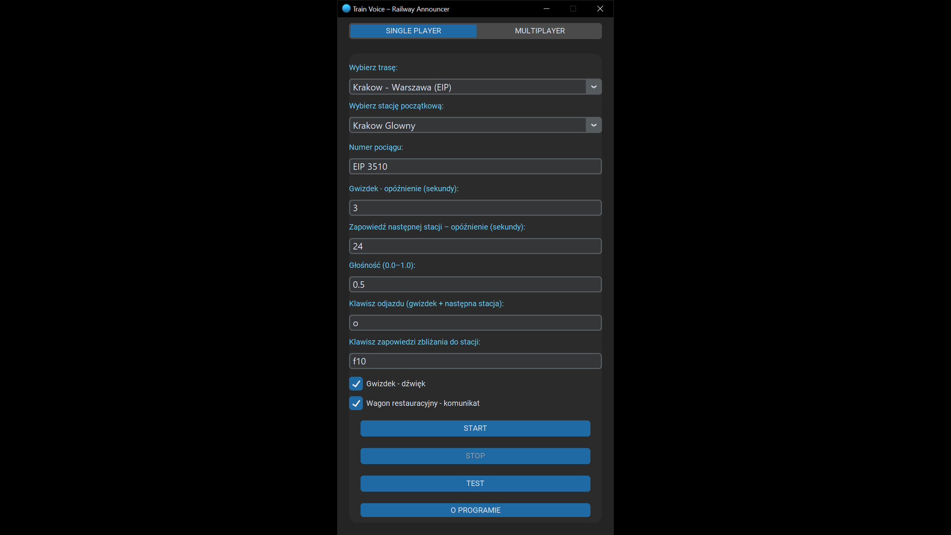 Desktop application for triggering passenger announcements during gameplay in railway simulators, available in Polish and English.